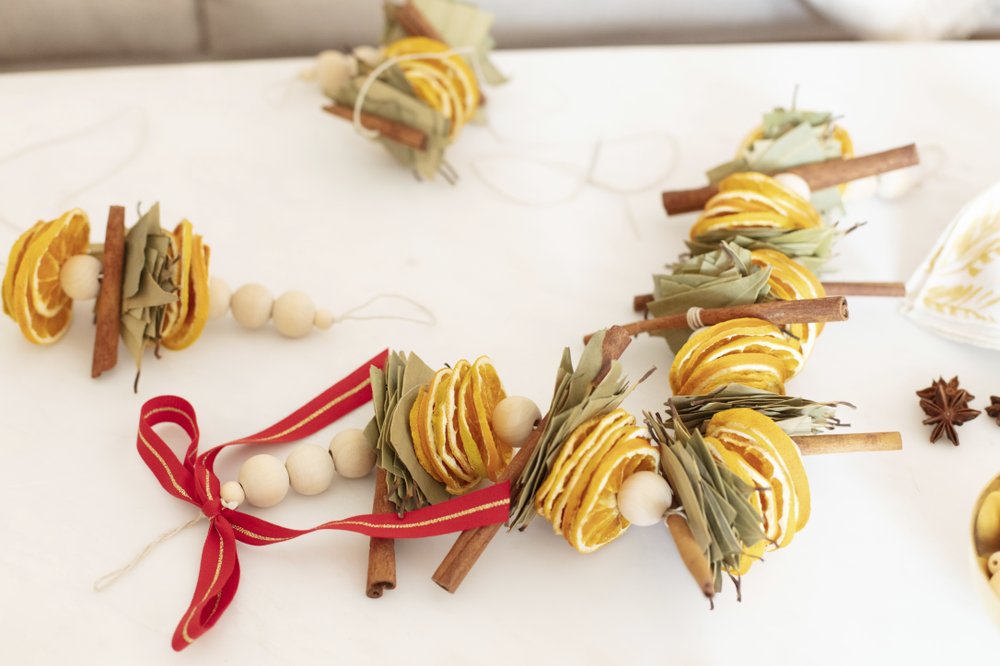 She’s also making garlands this year out of various materials, including fragrant dried orange slices. “You can display them on a mantle, bookcase, or drape one on your dining table surrounded by tea candles for a simple, aromatic centerpiece,” she says.