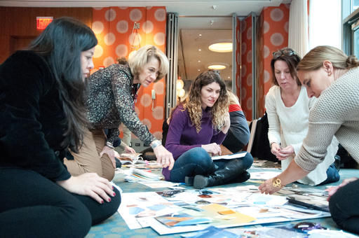 Small groups sprawled on the carpet with card-filled recipe boxes. They brainstormed, laying out arrays of coordinating colors that looked like mosaics, or game boards. Cards were edited in and out, until the palettes came together and there was a universal nod of satisfaction.