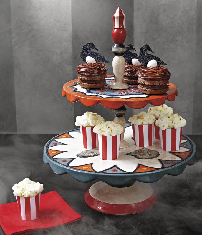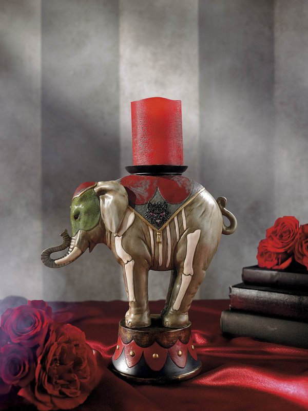 Grandin Road, for instance, has a circus tent-style tiered serving dish for treats. A painted resin elephant balances expertly on a stand, a candleholder perched on his back. Vintage-style signs offer palm reading and directions to scary attractions. And there’s a black and white print of a turn-of-the-century fire breather to hang on the wall. (www.grandinroad.com )