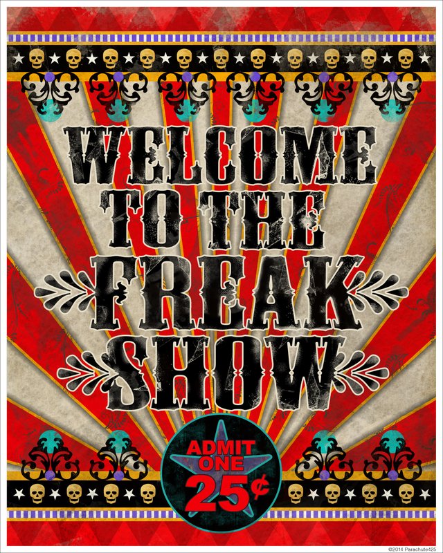 Vintage circus and funhouse posters are colorful and eye-catching, and you’ll find a variety of them on Etsy.com. For example: Chicago artist Terry Hoffman’s studio, Parachute 425, offers a gothic art “Freak Show” poster in a palette of carnival hues. (www.etsy.com/shop/parachute425 )