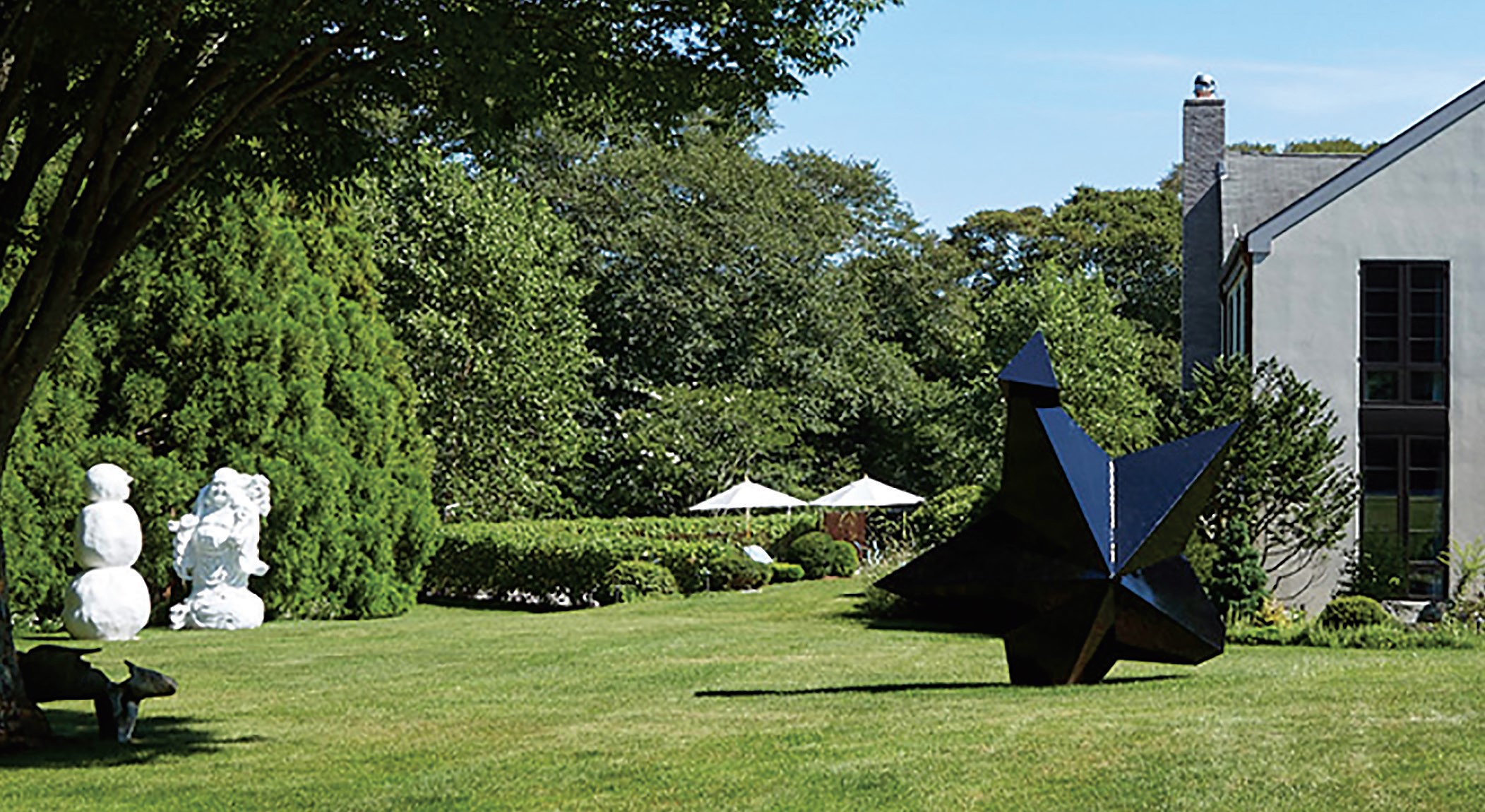 The owners of the 6,200-square-foot shingle-style home and two-acre property were fans of D’Apostrophe’s signature style using primary forms and clean-lined aesthetics. So the firm responded by creating a canvas for their eclectic and vast art collection. The collection includes several large-scale pieces that needed to be placed outdoors.