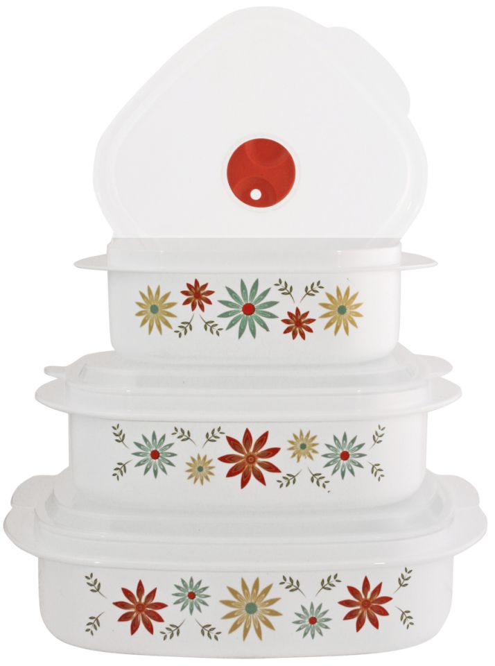 Boston Warehouse has a stoneware collection that can be used for cooking as well as storage. Pieces have modern geometric prints on them, and vented lids. (www.everythingkitchens.com ) Or check out Corelle’s enamel steel storage collection, in a variety of prints and patterns, ready to go from fridge to table. (www.wayfair.com)