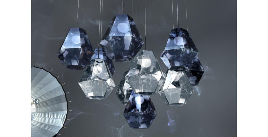 Euroluce’s exhibitor collections ran the gamut from over-the-top fixtures with a theatrical bent to slim, understated pendants. Color palettes ranged from the ethereal to the exuberant, and several designs were available as either suspension or wall-mount format. For example, Abate Zanetti’s collection included shapes evoking undersea life, like cellular creatures and fish, crafted of Murano glass; Bocci showed fixtures made by stretching, folding, and draping hot glass into giant pearlescent ribbon-candy lights that glowed via micro filaments; Stickbulb showed Boom, the studio RUX-designed chandelier made of redwood reclaimed from New York City’s dismantled water towers; and in Milan’s Cinema Manzoni, Tom Dixon took over the iconic theater to showcase furniture and lighting, including Cut, a giant faceted crystal form in a clear or smoke finish.