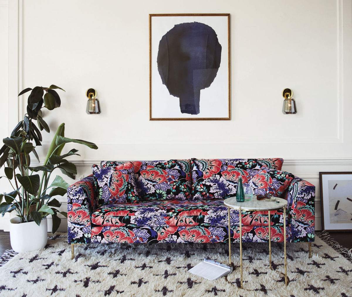A modern version of Liberty of London’s rich Feather Bloom floral print graces a sofa, ottoman and swivel chair in a new collaboration at Anthropologie. (www.anthropologie.com)