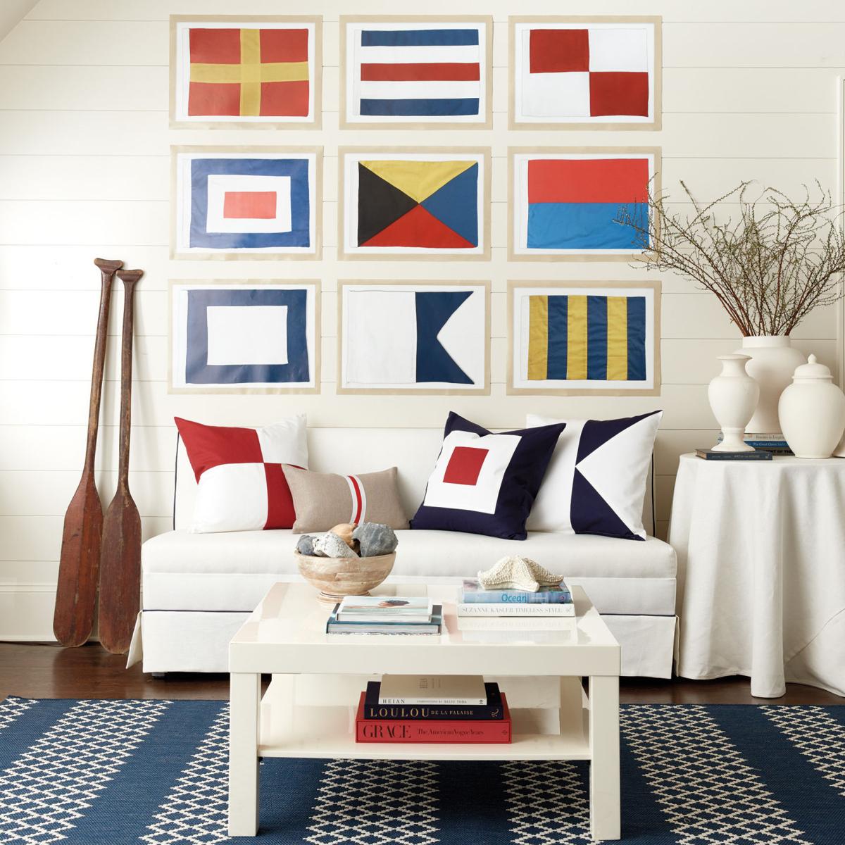 At Ballard Designs , there’s a mirror framed in faux white coral that would make a statement; it’s available in wall-mountable and floor sizes. Suzanne Kasler’s bold, graphic nautical flags come framed in natural wood.