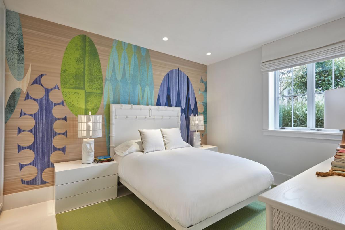 And there’s loads of lively art, from photoprints of giant waves to San Francisco artist Rex Ray’s groovy surfboard wallpaper, as well as a group of whimsical, painted shark heads from California ceramicist Lorien Stern.