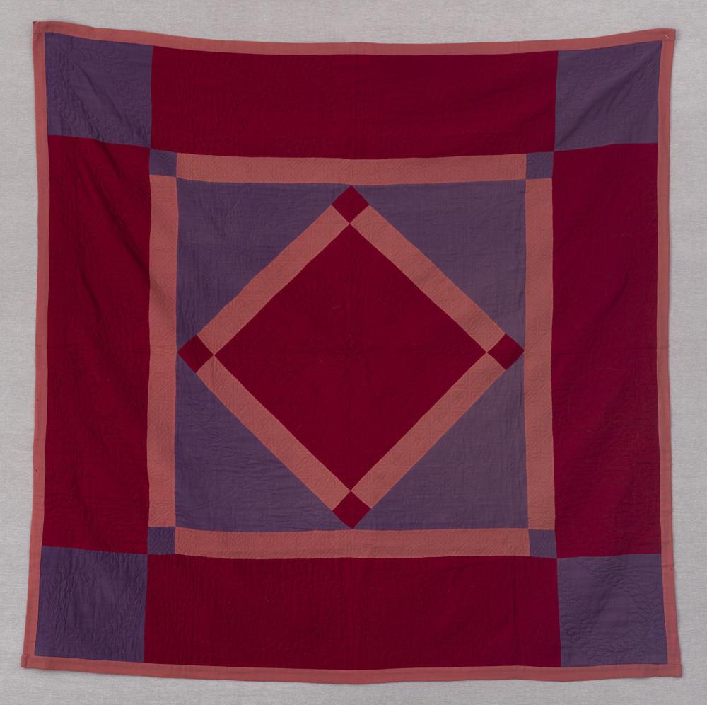 The exhibition also includes several colorblock quilts that look remarkably modern, including an early 20th century “Diamond in the Square” that’s probably Amish. Amish quilters preferred simple, geometric patterns and colors; the community frowned on overly pictorial motifs and multicolored patterns.