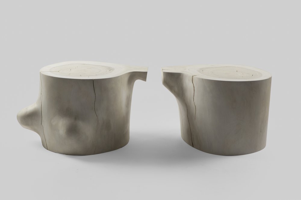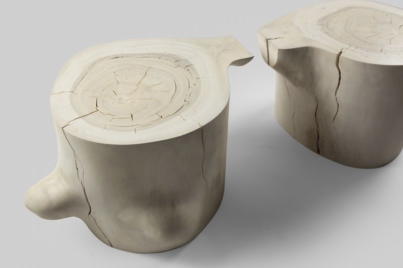 This photo shows Rhinebeck, N.Y based Sawkille Co.’s salvaged tree trunks made into stump tables and seating. They can be bleached, stained or custom dyed. (Sawkille Co. via AP)