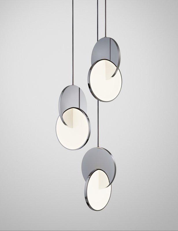The designs interpret the characteristics of sun and star reflection and light refraction in sculptural, spherical forms. Mirror-polished stainless steel and gold spheres are incorporated with concealed LEDs and acrylic discs and tubes, creating light sculptures in the form of pendants, table lamps and wall sconces. The names pay homage to the heavens: Eclipse, Orion, Tidal, Aurora.