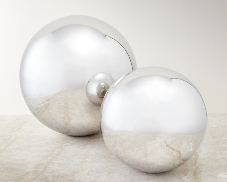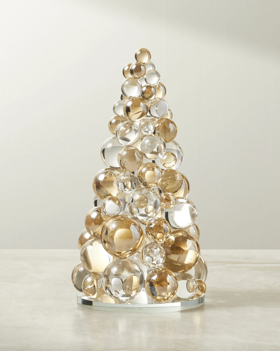 CB2 has a new collection of transparent, opaque, and reflective glass and metallic ornaments that give traditional holiday motifs a fresh twist. There are amber glass balls that look like bubbly champagne; a trio of modern pines in smoky hues; milky-white glass snowmen; stainless steel orbs; and mini presents in mirror-finished steel.