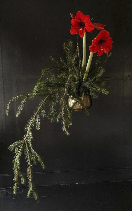 “Or put a potted amaryllis in a hanging planter, and fill the base with evergreens for an uplighting, magical arrangement that takes up little space.”
