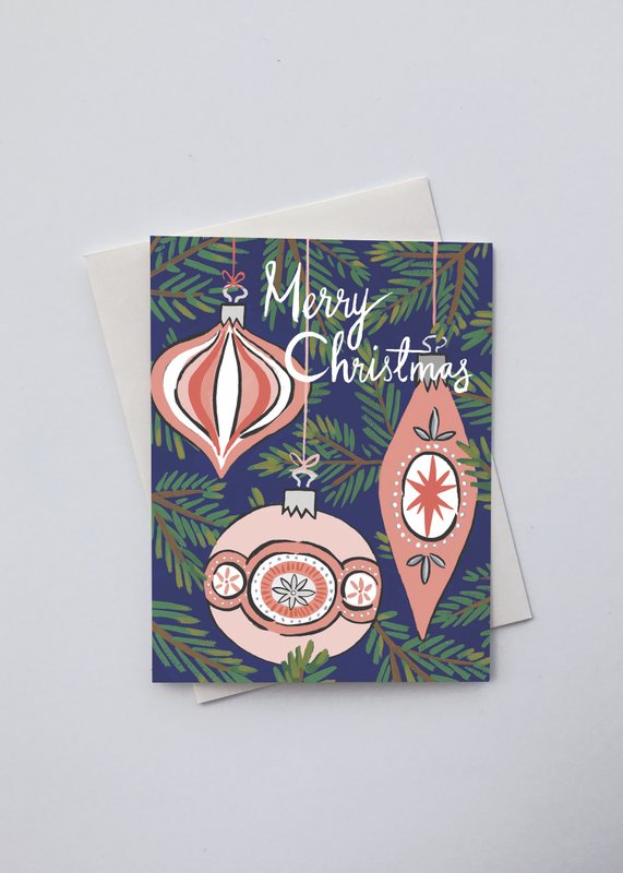 “Our wood ornaments are a fun throwback to the vintage baubles from midcentury Christmastime,” she says. “We hand-stain each piece of wood a dark warm shade that reminds us of the quality materials that were used to make furniture during that period.”