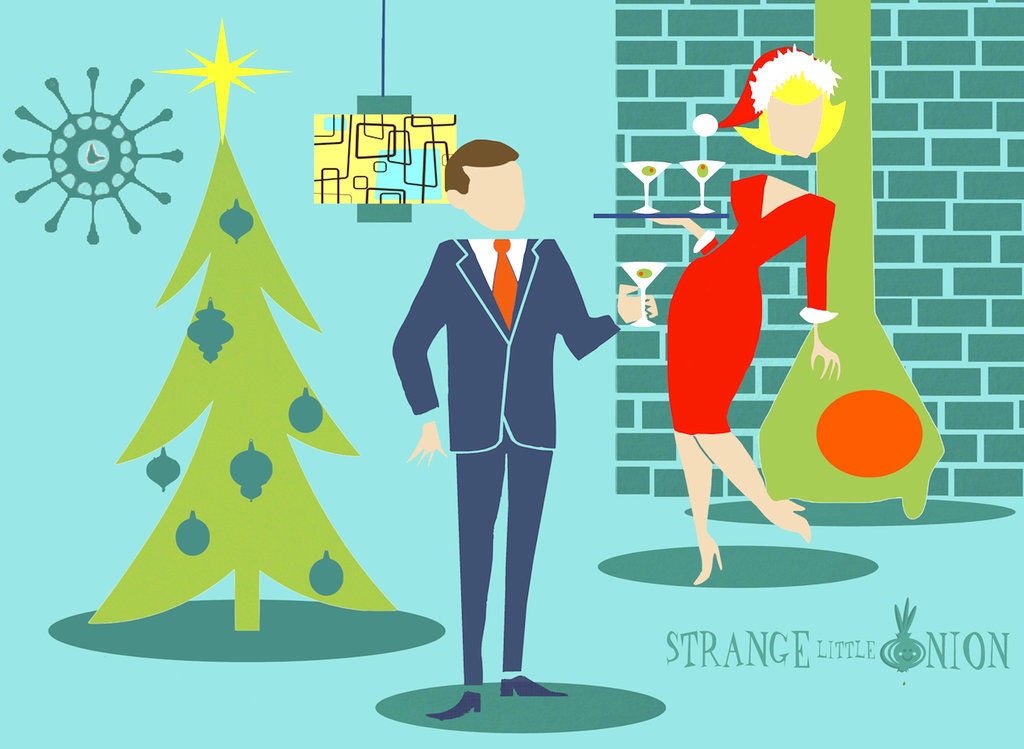 The scenes depict kicky, Jetsons-era holiday soirees in cool midcentury abodes. Pelt says he leaves out facial features on his cartoon revelers “so that no matter what you look like, you can see yourself attending the chic cocktail parties thrown by my kitschy little friends.”