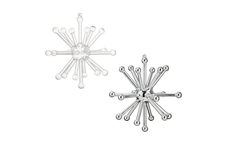 CB2 has several nice options for a retro holiday theme: There are trees and figures festooned with mirrored mosaics, as well as disco ball ornaments. A wreath made of white and gold metal dots makes a frothy, festive accessory for the mantel or front door. Create an atomic constellation using sputnik-shaped gold and silver ornaments made from glass. Or opt for a 3-D mobile effect with a set of gold-toned wire ornaments in retro shapes. (www.cb2.com )