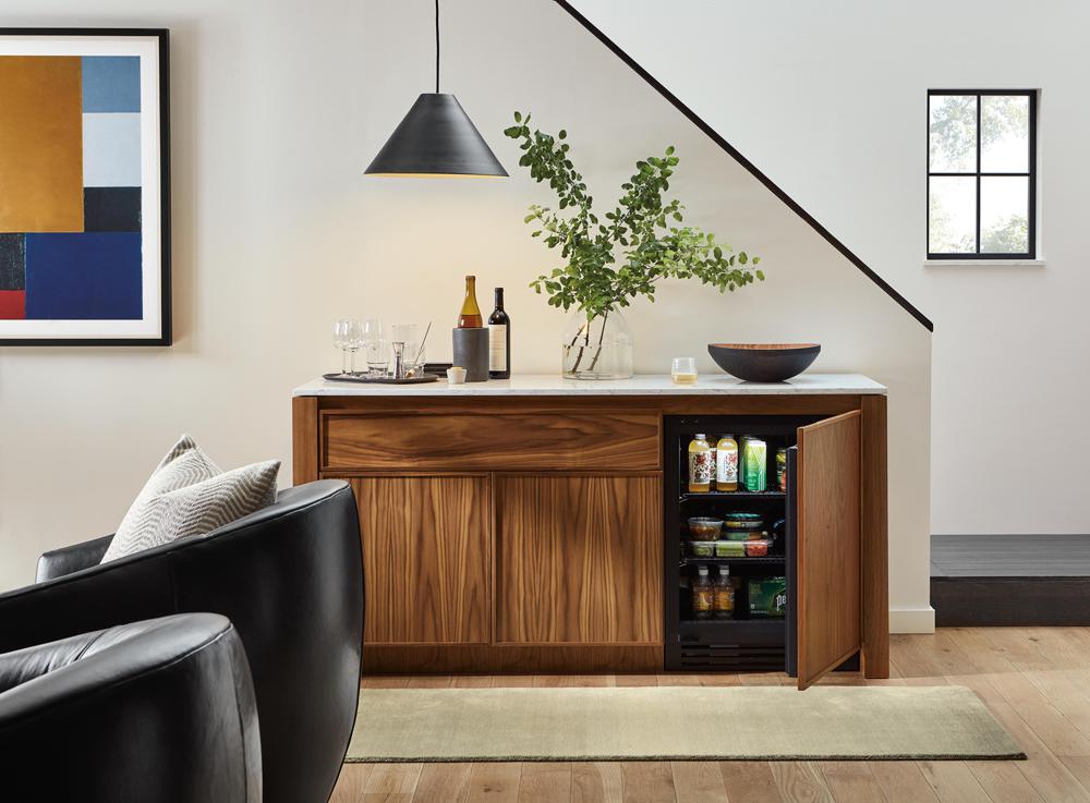 Room and Board has teamed up with the St. Louis-based refrigeration company True Residential to create the Amherst cabinet, a clever white oak or walnut storage piece with a built-in fridge that can work as a resting spot for a TV, books or art objects.