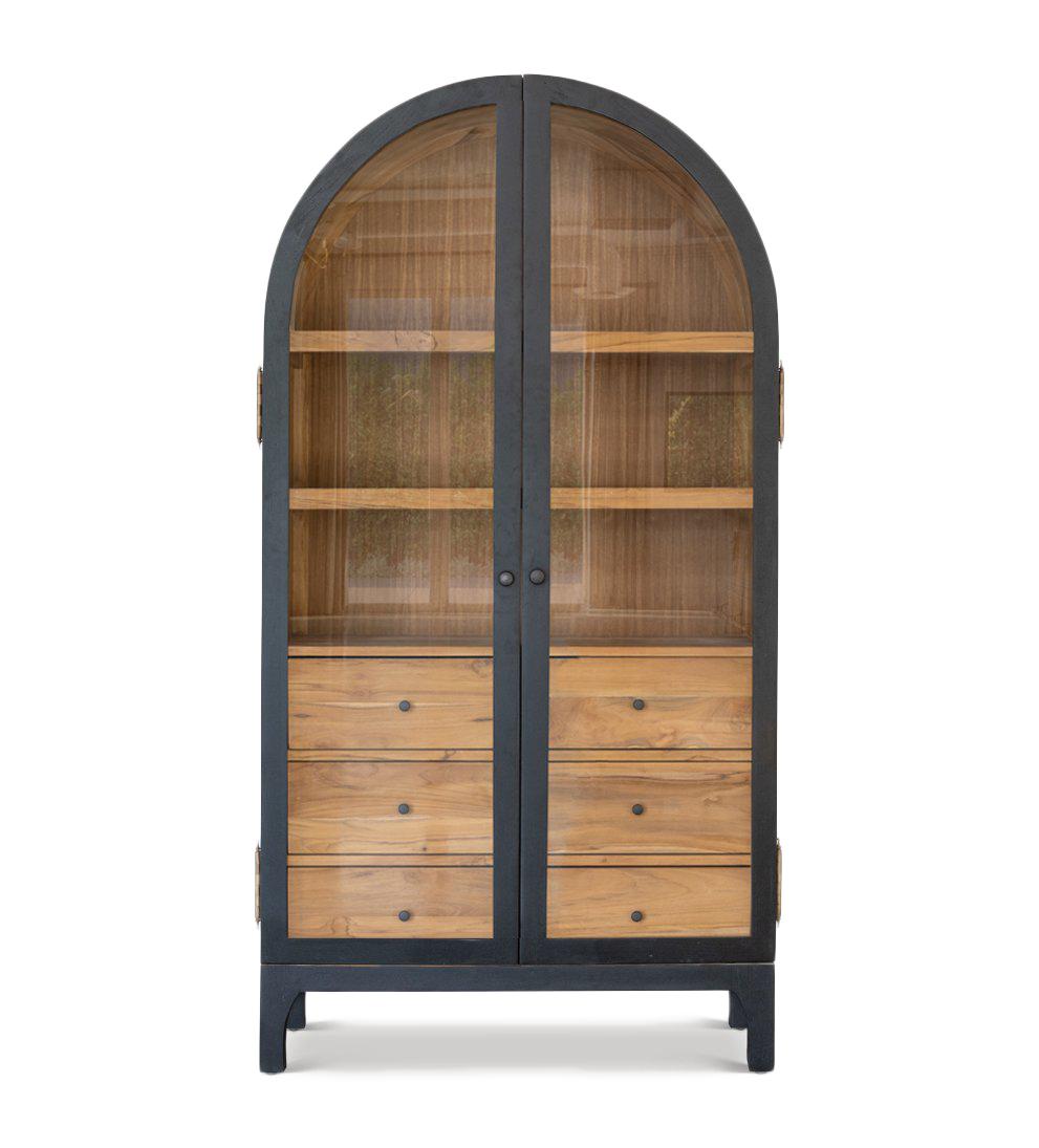 Designer Lindye Galloway of Costa Mesa, California, looks to her Golden State roots for inspiration. Her Bixby hutch features the rounded silhouette of Big Sur’s Bixby Canyon Bridge arch, in natural teak trimmed in black. And her California credenza brings a modern, coastal vibe to a teak-framed, cane-fronted cabinet with brass detailing.