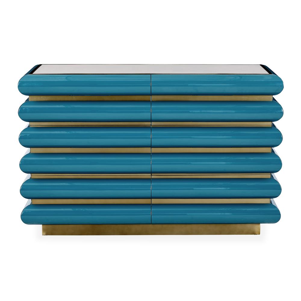 His spring collection includes the Kiki cabinet, which nods to trending Art Deco. The cabinet is faced with rows of plump, lacquered capsules, in ivory or deep teal, edged in brushed brass. Two velvet-lined drawers are tucked inside.