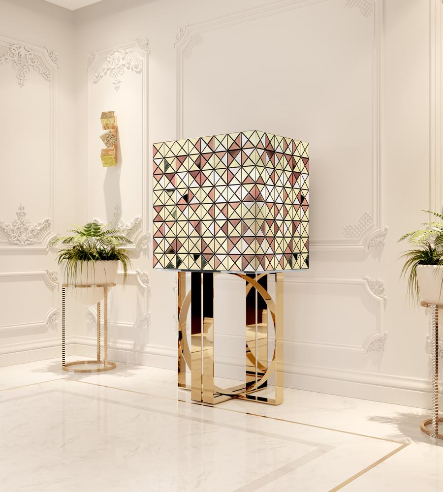 Boca do Lobo’s Pixel bar cabinet exterior is clad in over a thousand multicolored triangles made of woods like palisander and African walnut, evoking a pixelated image. Inside, mirror and diamond-quilted blue silk showcases nine drawers, each with a golden knob.