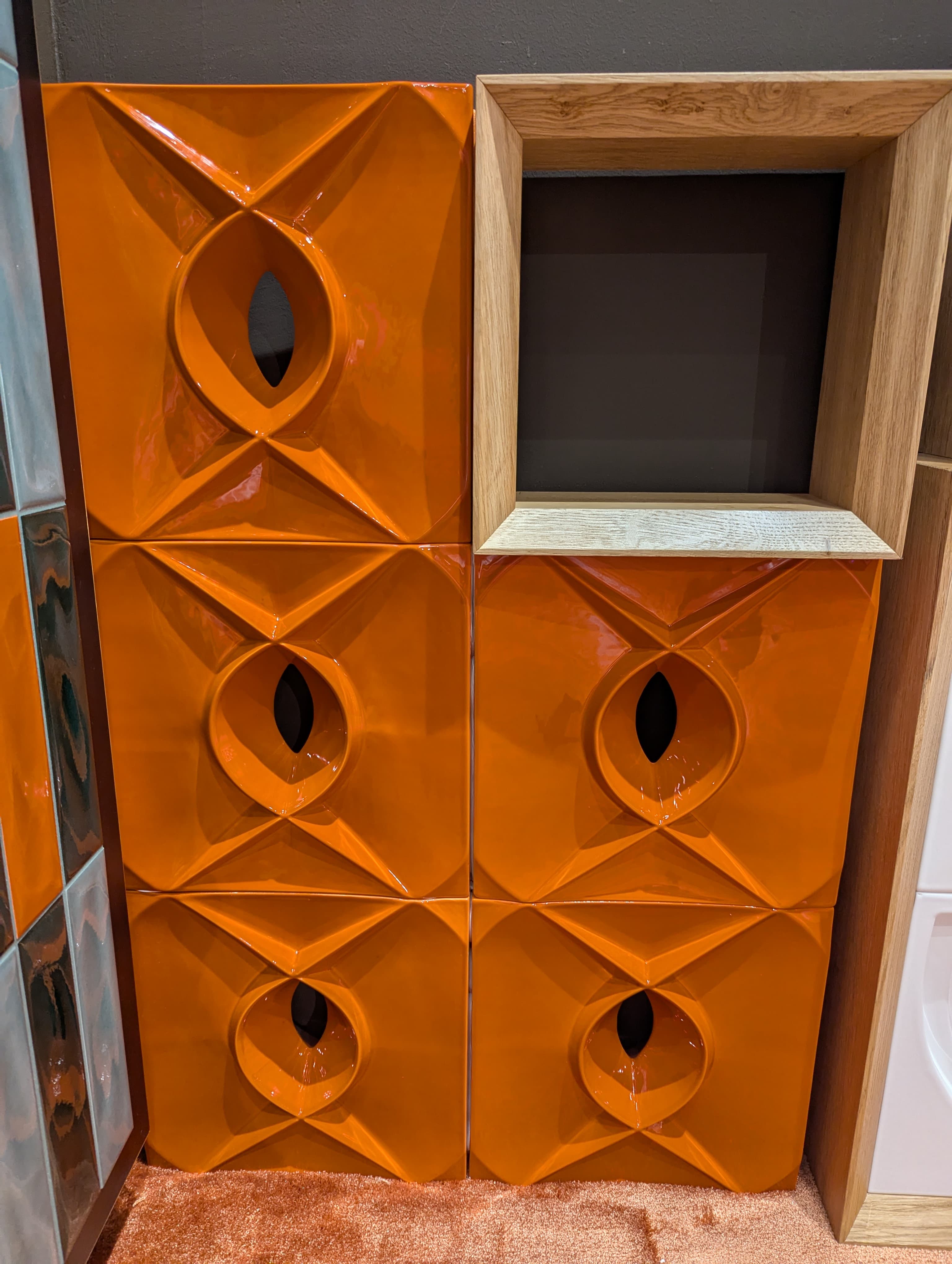 Boton tiles resemble glossy, oversized candies. Riva, by contrast, has a muscular, Brutalist vibe. At the show, the tiles were used not just on walls but to form credenzas, stools, cabinets and trays.