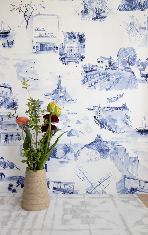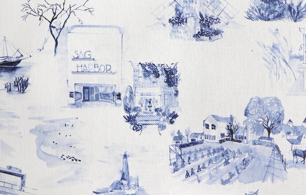 New York textile design studio Eskaye l has a new pattern called Out East; founder Shanan Campanaro’s watercolor toile paintings were drawn from photos of the Hamptons sourced through interior design firm Curious Yellow. Montauk landmarks like the lighthouse and clam bar, Sag Harbor’s windmill and theater, and Sagaponack’s vineyards and stables are among the images. The collection is available as both wall covering and fabric.