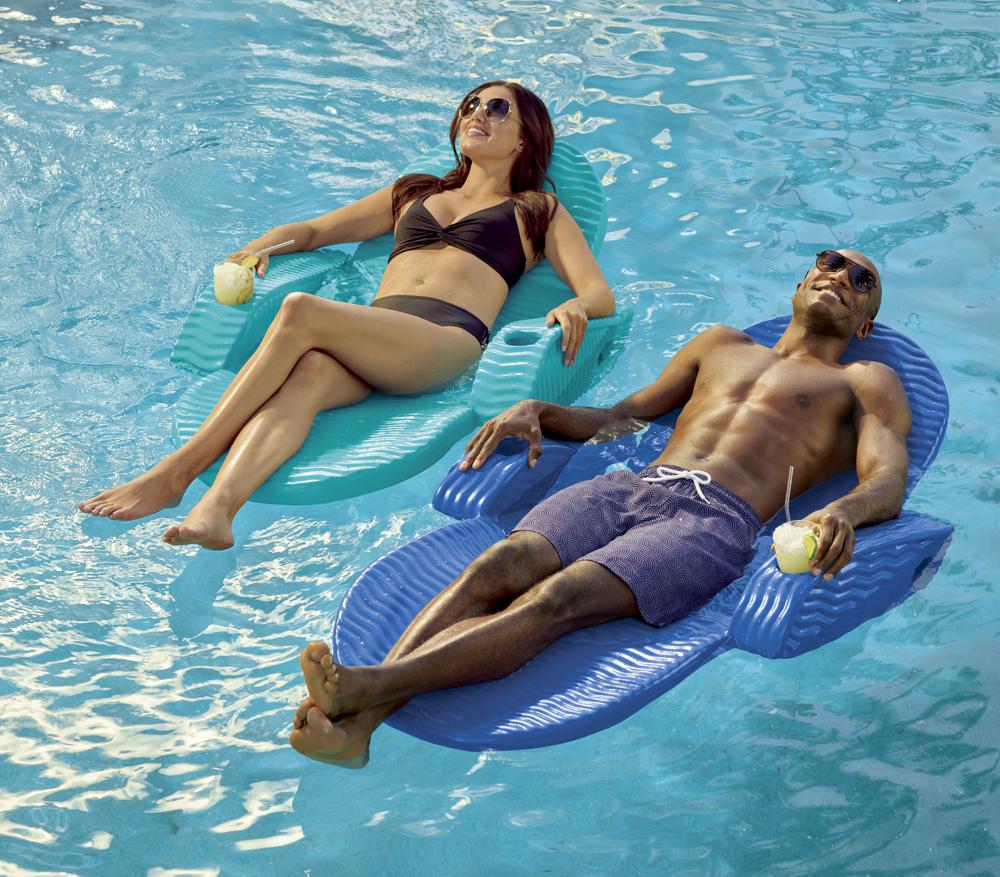 If you prefer sitting up a little, Frontgate’s got a floating armchair with attached ottoman. Choose from aqua, blue or flamingo pink. Or splash out on a full-size pool chaise kitted out with drink holders.