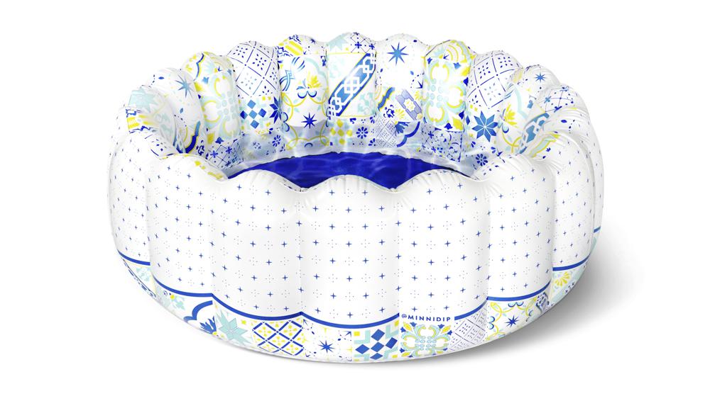 One company, Minnidip, makes inflatable “adult kiddie pools” that aim to transport you to some exotic travel destination. Patterns on the Marrakesh pool reference Moroccan architectural details, while the Amalfi is a nod to the blue, yellow and white tile of the Italian coast.