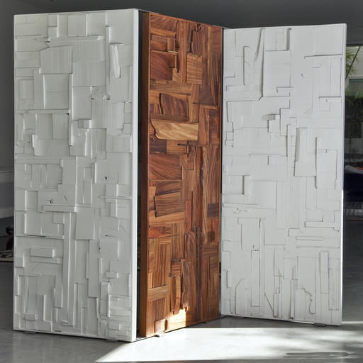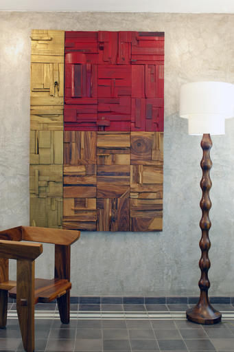 Peter Glassford of San Antonio fused his studio art background and his marketing and design job with a high-end Mexican furniture maker to create sculptural installations with the tropical hardwood off-cuts left over from furniture making. He now produces mass-market collage squares representative of his original signed art. The dramatic 3-D designs, which can be lacquered in custom hues, evoke the Abstract Expressionist work of American sculptor Louise Nevelson.